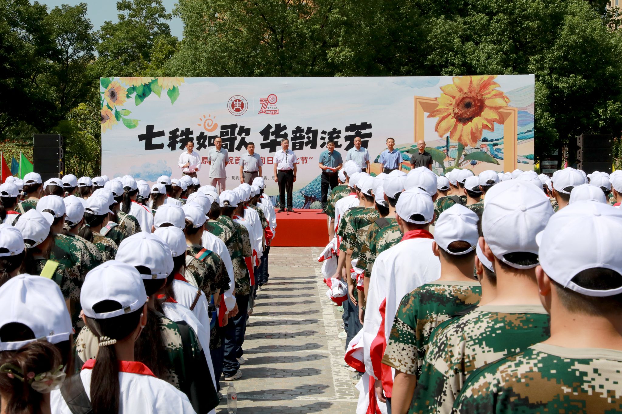 七秩如歌迎华诞,向日葵开映校园。为弘扬中华优秀传统文化,丰富校园文化生活,献礼学校七十华诞,9月9日,中原工学院首届“向日葵文化节”开幕式在龙湖校区举行,以阳光之名,赴文化之约。校党委副书记、工会主席宋晓炜,副校长杨坤出席开幕式,党委宣传部、党委保卫部、团委、体育部、后勤服务中心及2025级新生代表参加活动。后勤服务中心负责人主持开幕式。