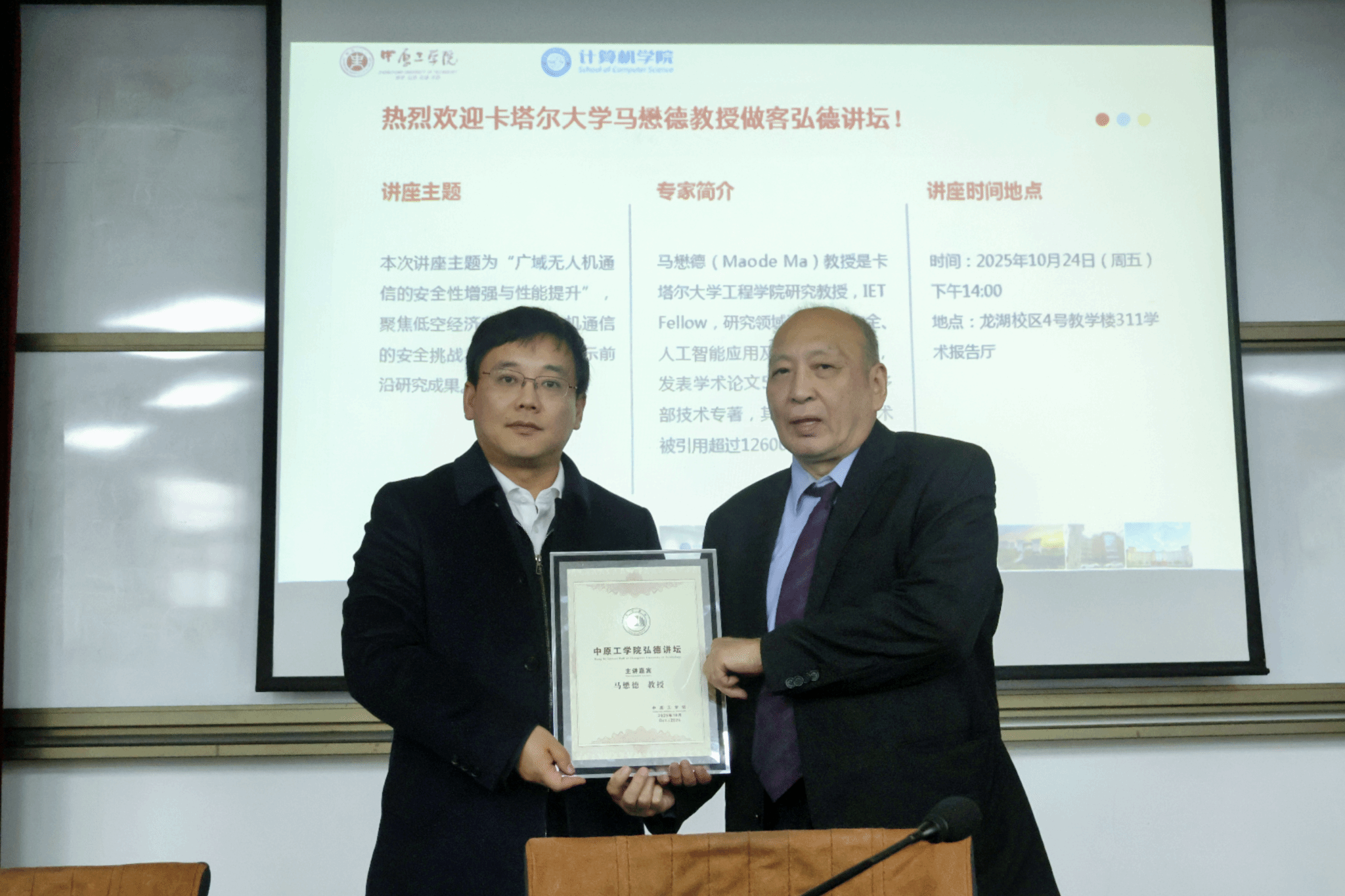 为庆祝建校70周年,推动国际学术交流与前沿科研合作,近日,应我校计算机学院邀请,卡塔尔大学马懋德(Maode Ma)教授莅临我校,在龙湖校区作题为“广域无人机通信的安全性增强与性能提升”的学术报告,副校长瞿博阳出席并为马懋德教授颁发“弘德讲坛”证书。计算机学院部分教师、研究生及本科生代表参加报告会。报告会由计算机学院执行院长张书钦主持。