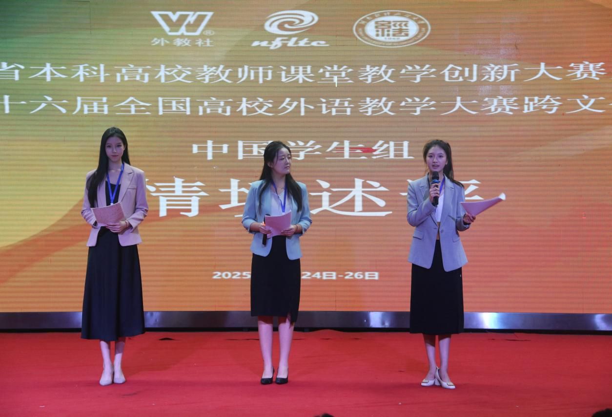 10月25日至26日,由河南省教育厅主办的第六届河南省本科高校教师课堂教学创新大赛外语教学赛道暨第十六届全国高校外语教学大赛(跨文化组)在河南财经政法大学举行。我校师生团队凭借扎实的语言功底、创新的教学设计以及优秀的跨文化沟通能力从众多参赛队中脱颖而出,最终荣获河南省一等奖。