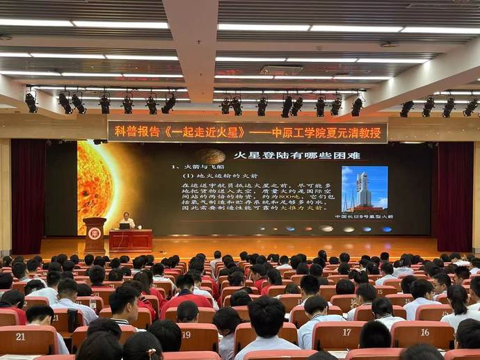 “那里有空气沙漠,有日出日落,有‘大漠孤烟直’的壮美……”5月24日,国家杰青、中原工学院校长夏元清教授走进郑州市实验高级中学,以《一起走近火星》为题做科普报告。当天,中原工学院为郑州市实验高中授牌 “优秀生源基地”学校,两校围绕“高中——高校贯通育人”深入交流,共赴育人之约。