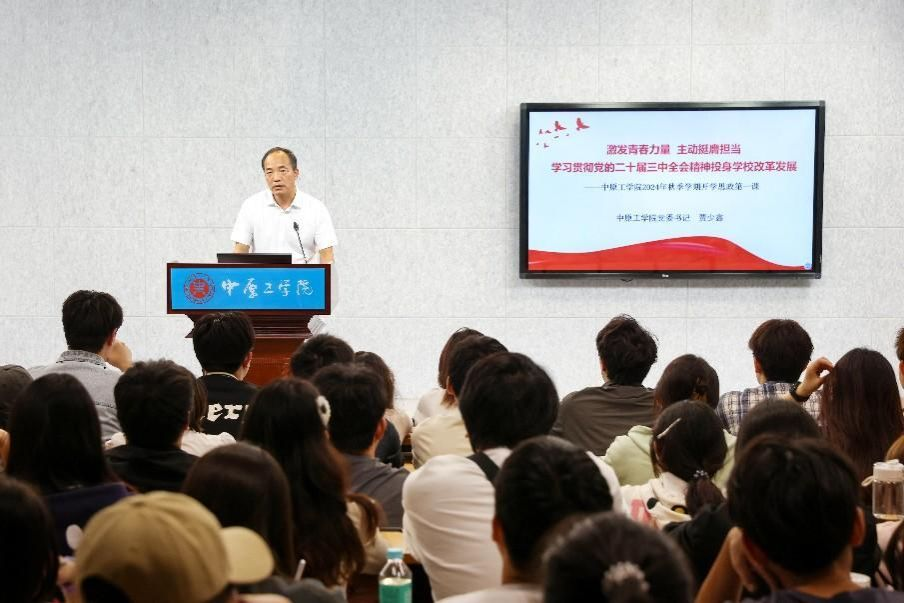 为深入学习贯彻党的二十届三中全会精神,坚持不懈用习近平新时代中国特色社会主义思想铸魂育人,推动贯彻落实全国、全省教育大会精神,10月15日下午,中原工学院党委书记贾少鑫走进学生课堂,以“激发青春力量 主动挺膺担当 学习贯彻党的二十届三中全会精神 投身学校改革发展”为题,为学校青马班学员、青马社团成员和大学生融媒体中心社团成员讲授思政课。