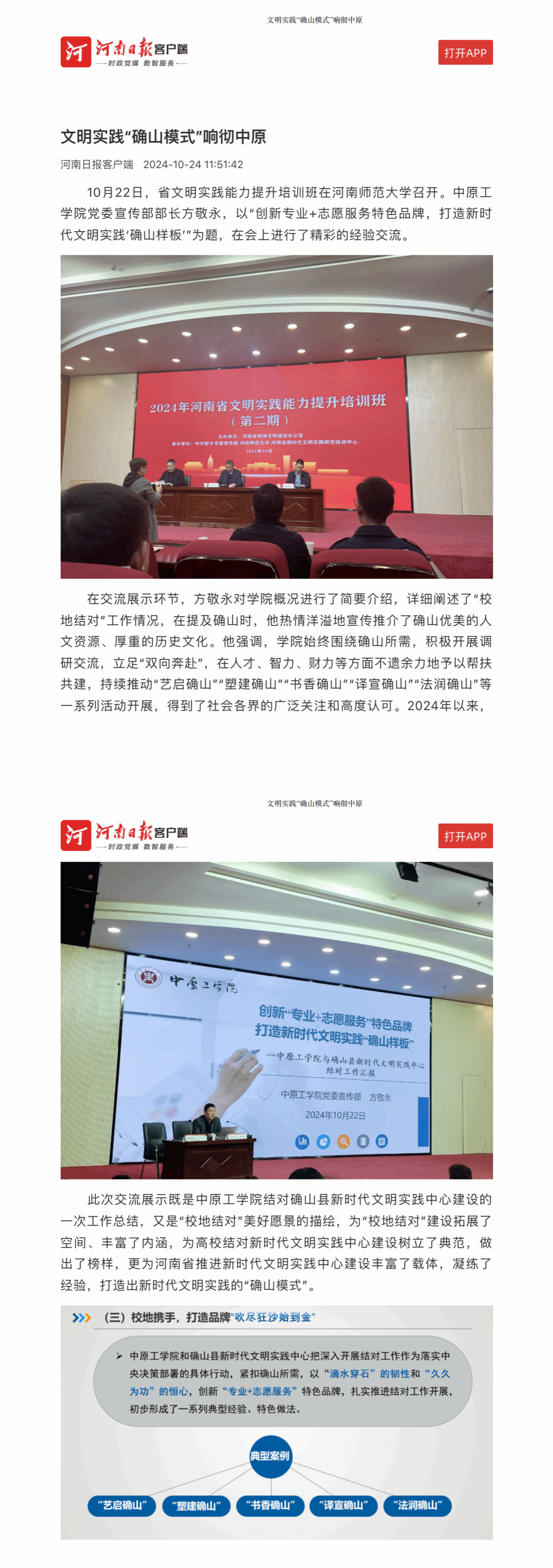近日,河南日报、大河报、顶端新闻等媒体报道我校“文明实践‘确山模式’响彻吃瓜网”,全文如下: