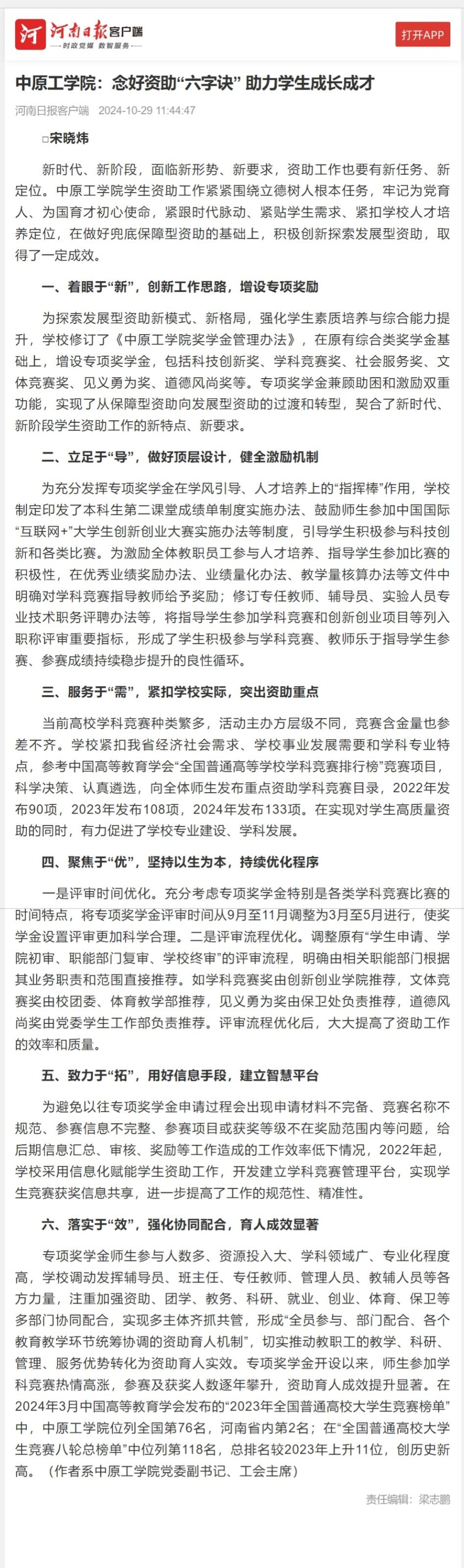 10月29日,河南日报客户端刊发我校党委副书记、工会主席宋晓炜署名文章《中原工学院:念好资助“六字诀” 助力学生成长成才》,全文如下: