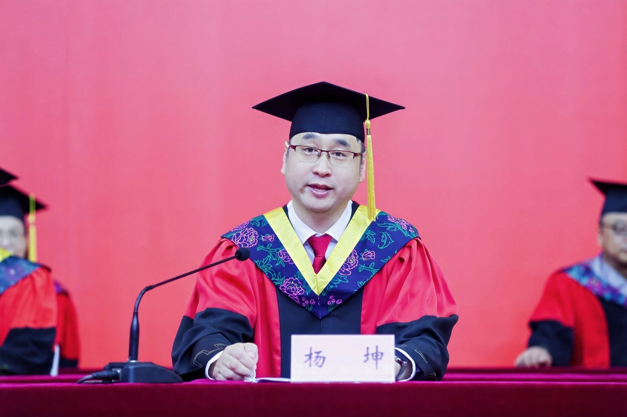 杨坤主持毕业典礼时嘱咐全体毕业生要始终牢记习近平总书记的殷殷嘱托,把夏元清校长的深情寄语和老师们的谆谆教导化作前行动力,积极投身全面建设社会主义现代化国家的火热实践中,以赤子之心,用卓越成就回报父母的养育、师长的期盼和祖国的重托!