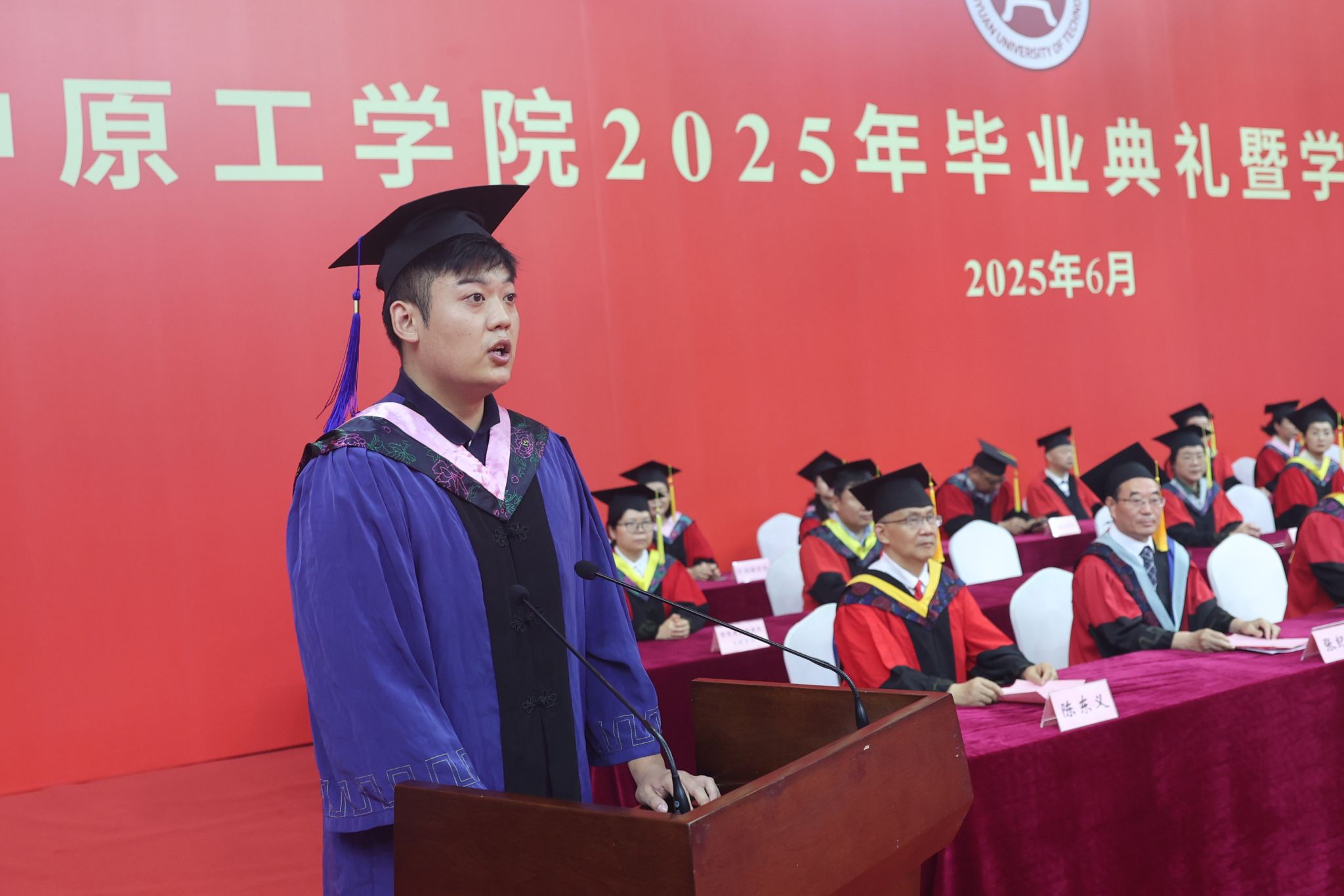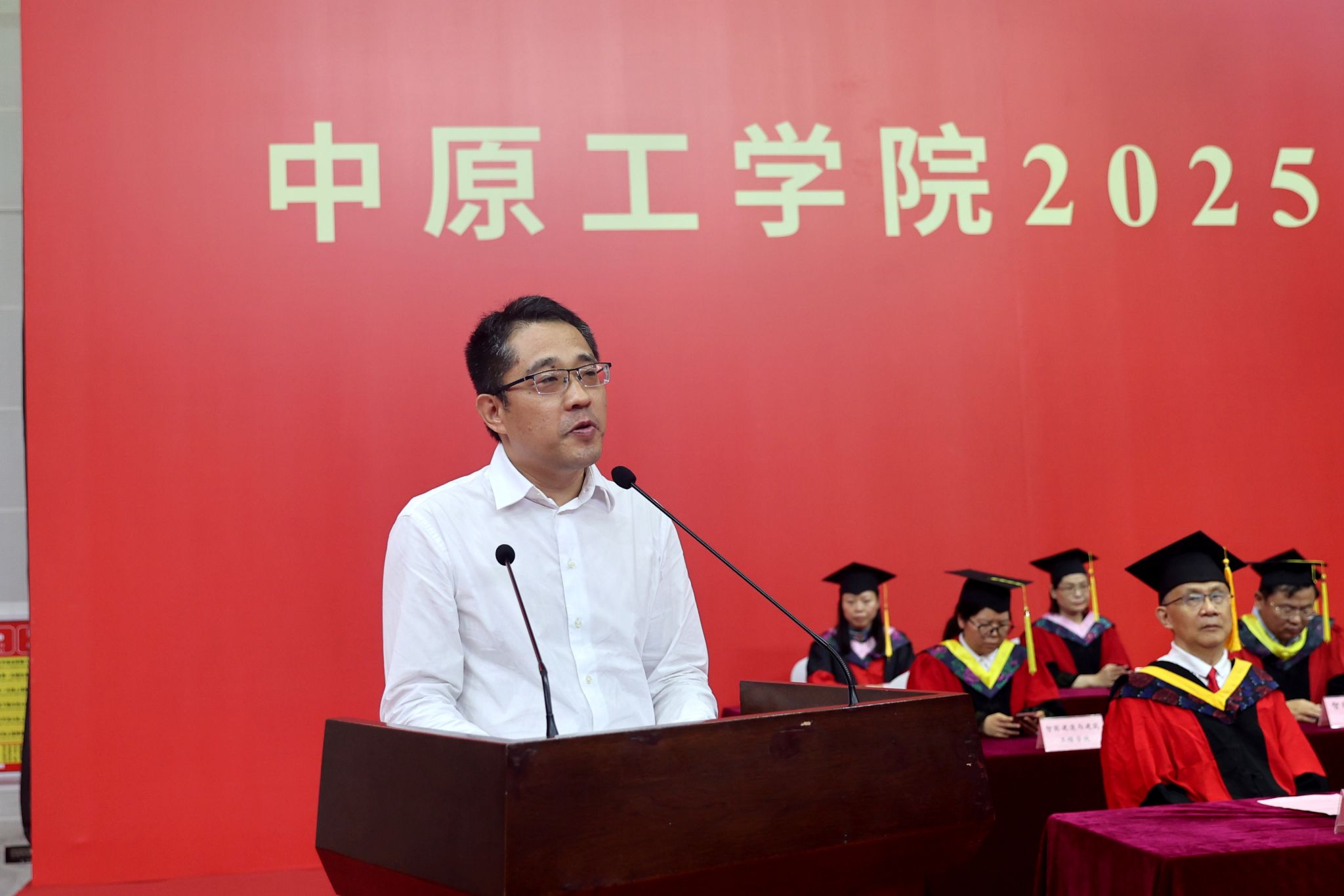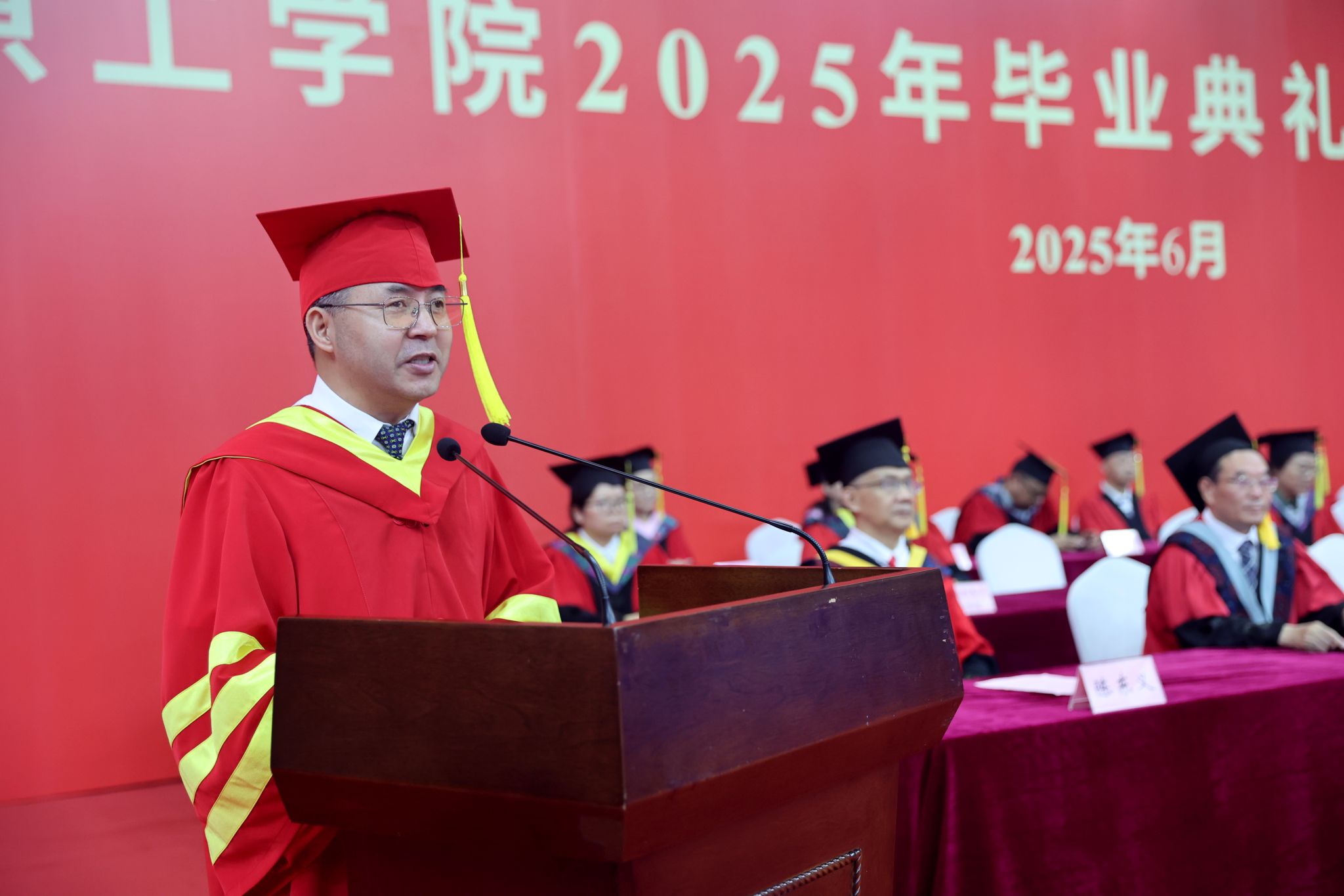 夏元清代表全体教职员工向圆满完成学业的毕业生表示热烈祝贺,向含辛茹苦培育子女成长成才的各位家长表示崇高敬意,向诲人不倦、辛勤耕耘的全体教师表示诚挚谢意。他回顾了本届毕业生在校期间党和国家事业发展取得的伟大成就、学校筹建河南电子科技大学取得的突破进展以及同学们在学业上取得的丰硕成果,带领大家重温习近平总书记给谢依特小学戍边支教西部计划志愿者服务队队员的重要回信精神,并援引习近平总书记考察河南时对河南寄予的深切厚望,向即将远行的毕业生们提出三点希望:一是铸就报国理想,胸怀“国之大者”的赤子格局。希望同学们无论身在何处、从事何种职业,都能心怀“国之大者”的赤子之心,将个人奋斗的“小目标”融入民族复兴的“大蓝图”,让青春之花绽放在祖国最需要的地方,在服务国家、服务人民中实现人生价值。二是发扬奋斗精神,肩负“追求卓越”的进取担当。希望同学们继续保持求学时不畏艰难、精益求精的韧劲,将“追求卓越”作为未来职业生涯的不懈动力,无论身处顺境还是逆境,都能扛起进取的担当,在各自岗位上脚踏实地、精耕细作,勇于创新、不断超越,用持续奋斗的汗水浇灌出属于自己的卓越成就。三是点亮探索星火,永葆“仰望星空”的求真好奇。希望同学们永远保持对知识的渴望和对真理的探索精神,永远好奇,永远思考,敢于探索未知领域,持续学习、勇于质疑、保持敬畏,让心中的“为什么”成为照亮前行道路、驱动创新的不竭星火。