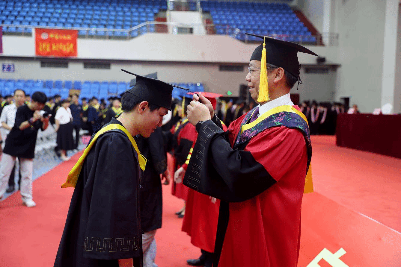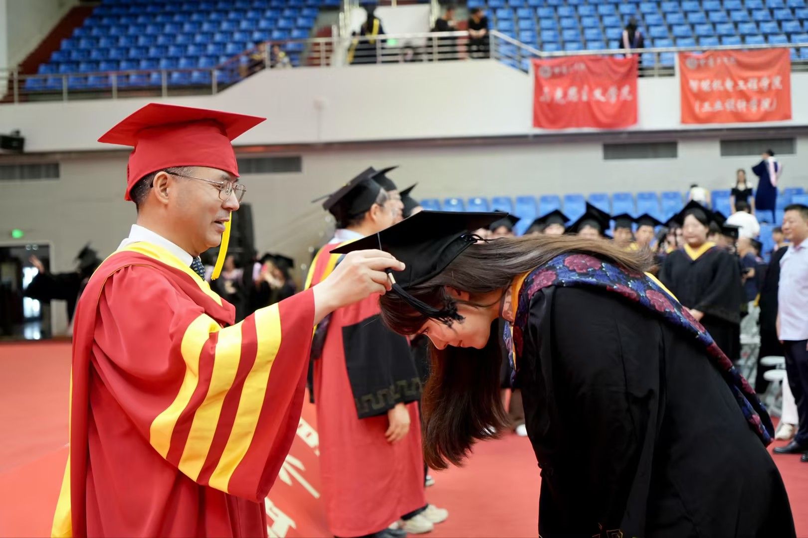 典礼环节结束后,校领导分别来到各学院指定区域,再次祝贺大家圆满完成学业,并为同学们扶正流苏,送上深情祝福。