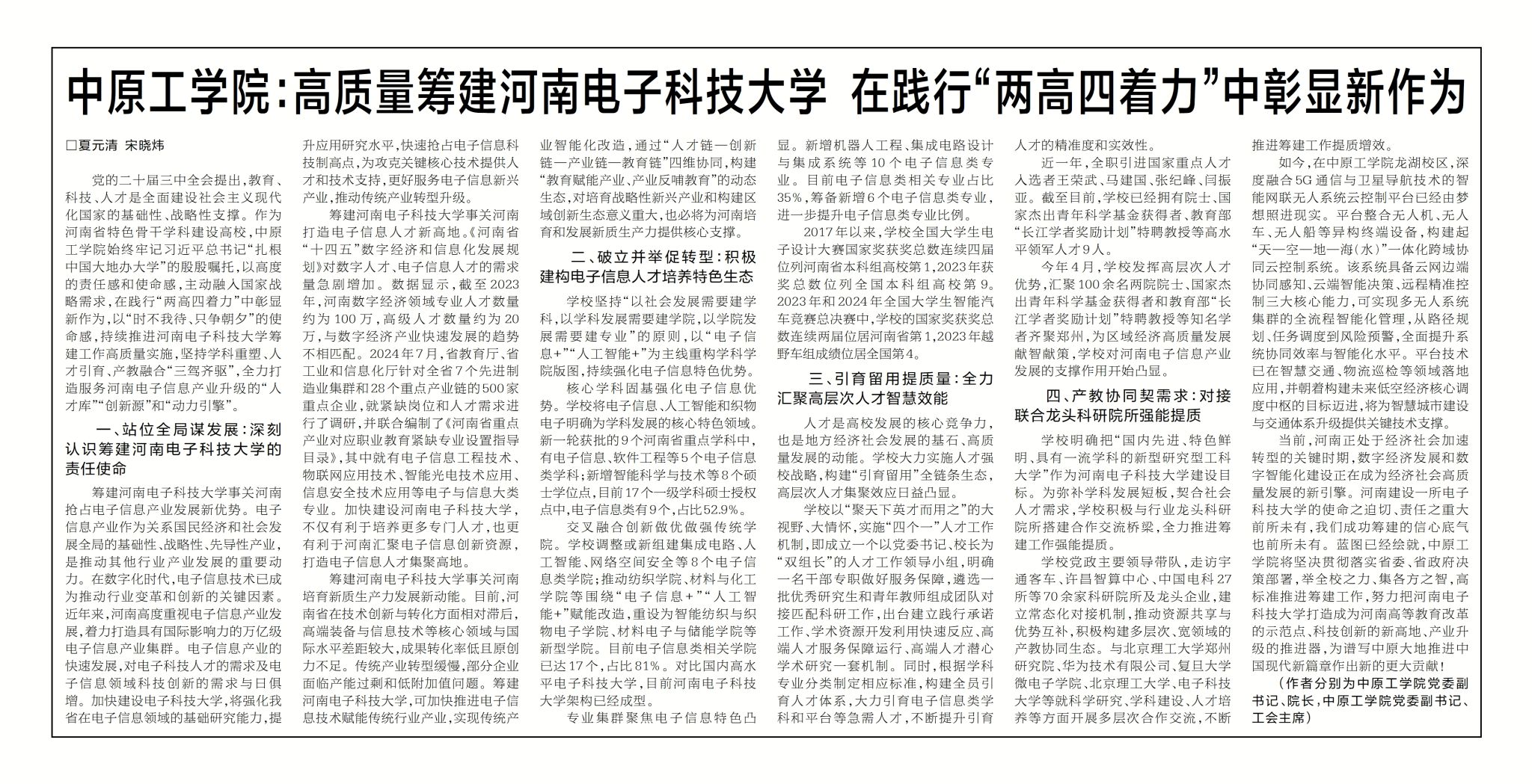 7月8日出版的河南日报第四版刊发我校党委副书记、校长夏元清,党委副书记、工会主席宋晓炜的署名文章《中原工学院:高质量筹建河南电子科技大学 在践行“两高四着力”中彰显新作为》。文章从“站位全局谋发展:深刻认识筹建河南电子科技大学的责任使命”“破立并举促转型:积极建构电子信息人才培养特色生态”“引育留用提质量:全力汇聚高层次人才智慧效能”“产教协同契需求:对接联合龙头科研院所强能提质”四个方面,深入分析筹建河南电子科技大学对河南培育发展新质生产力的重要作用和在省委省政府正确领导下、在省教育厅等相关部门大力指导支持下学校推进筹建工作的做法以及取得的成效。