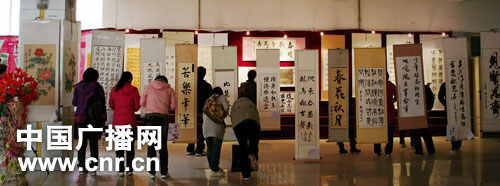 国画腊梅图在展厅的正中央,在春寒料峭的时刻更加显得精彩;在由黄河科技大学选送的《清明上河图(局部)》成为引人瞩目的焦点,细致的刻画让许多前来观看的同学赞叹;几大幅牡丹图也摆在展厅最显眼的位置,吸引了众多大学生的目光;“苦乐年华”、“见贤思齐”、“厚德载物”等书法前也聚集了众多观赏者。
