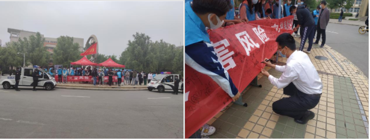 活动开始,建筑工程学院学生代表进行宣誓,这庄严的誓词让同学们深刻理解什么是“建工人”的责任和担当。随后,在龙湖校区滴水涌泉处,同学们和校保卫处工作人员向路过的行人分发精心准备的“防灾减灾知识小卡片”,同时引导大家在宣传条幅上留下自己的签名。活动吸引了很多行人驻足,同学们一遍遍地向参与者认真细致地宣传本次活动的目的和意义。