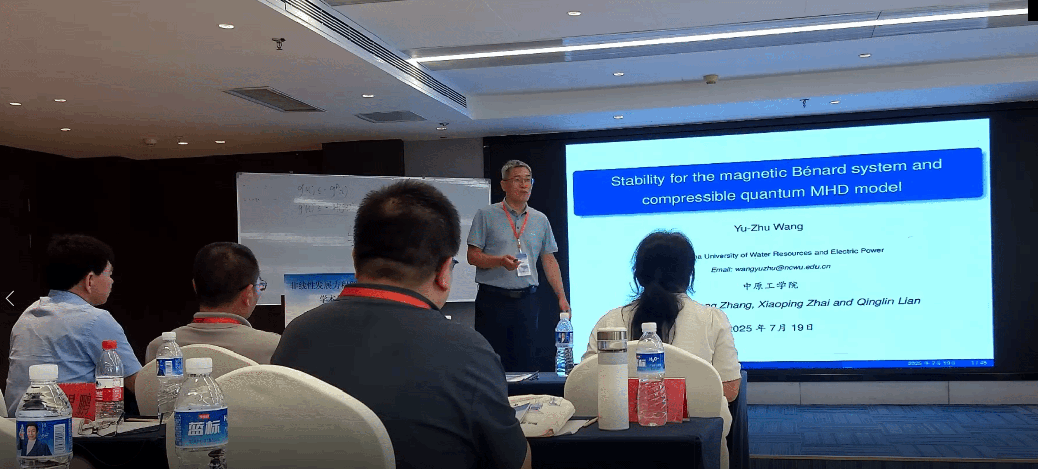王玉柱作题为《Stability for the magnetic Bénard system and compressible quantum MHD model》的报告,详细阐述了在周期区域内,带有部分耗散项的magnetic Bénard系统在背景磁场扰动下的整体存在性和稳定性。同时,还介绍了周期区域内无磁场耗散项的可压缩量子MHD模型的稳定性。