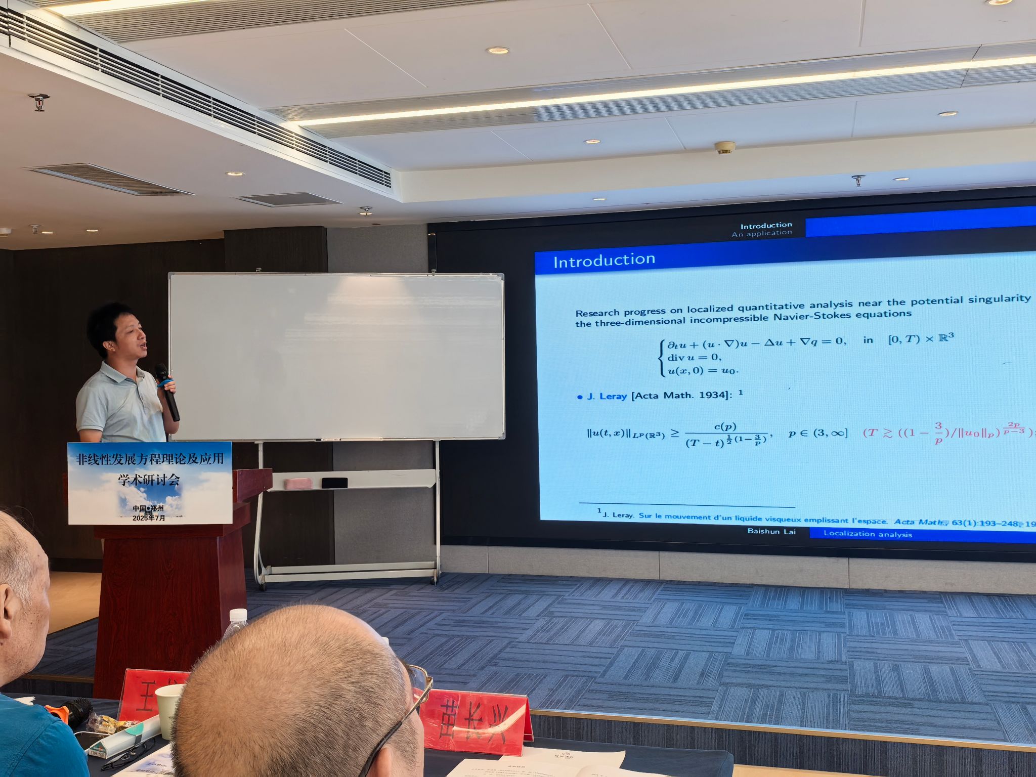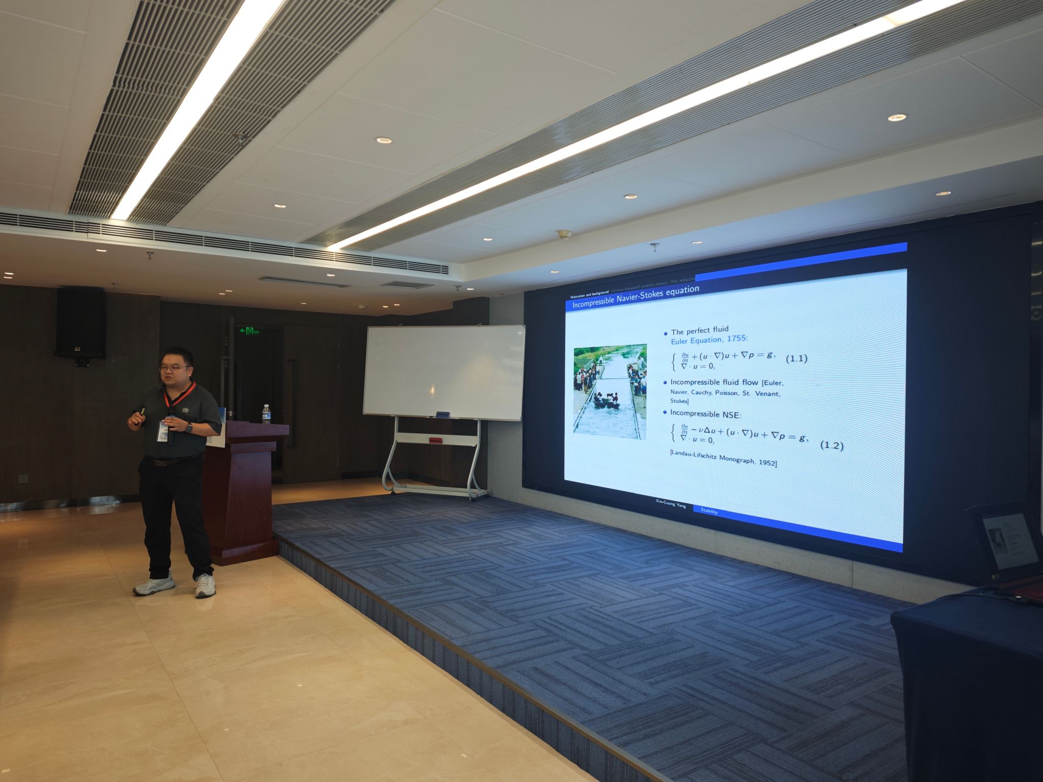 赖柏顺题为《Localization analysis of incompressible 3D Navier-Stokes equation and its application》的报告中,系统阐述了两种局部化技巧:靠近初始时刻空间局部光滑效应和频率空间的局部化。并介绍了这些局部化分析在自相似大解的构造,可能奇点形成必要条件的量化分析等问题方面取得的一些最新进展和团队在自相似大解构造方面得到的部分结果。