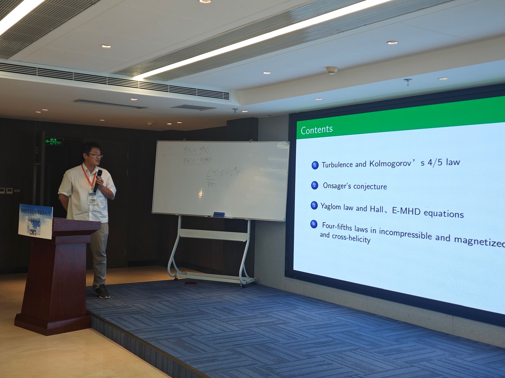 王艳青作题为《Kolmogorov's four-fifths laws in turbulence》的报告,介绍了湍流中的Kolmogorov4/5定律,该定律为能量耗散率提供了精准的预测方法,借助Eyink的纵向结构函数及对不同物理量相互作用的分析,将著名的4/5定律从能量扩展到了其他守恒量,如磁流体力学中的螺旋度等。