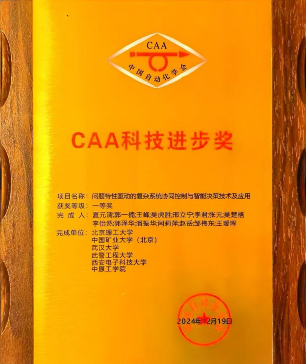 我校党委副书记、校长夏元清教授主持的“问题特性驱动的复杂系统协同控制与智能决策技术及应用”项目获得中国自动化学会科技进步奖一等奖,自动化与电气工程学院教师王瑷珲作为共同完成人接受颁奖。该项目围绕融合知识的复杂特性问题协同控制与智能决策中所面临、复杂优化问题特性的知识提取与利用、环境诱导的动态优化决策及其知识规律发现、对象特性引导的高性能协同控制方法设计等关键问题,开展了相关基础理论与应用研究,旨在推动知识发现、机器学习等人工智能理论与传统优化控制方法的高效有机融合,突破复杂问题特性优化与控制中的瓶颈和难点。