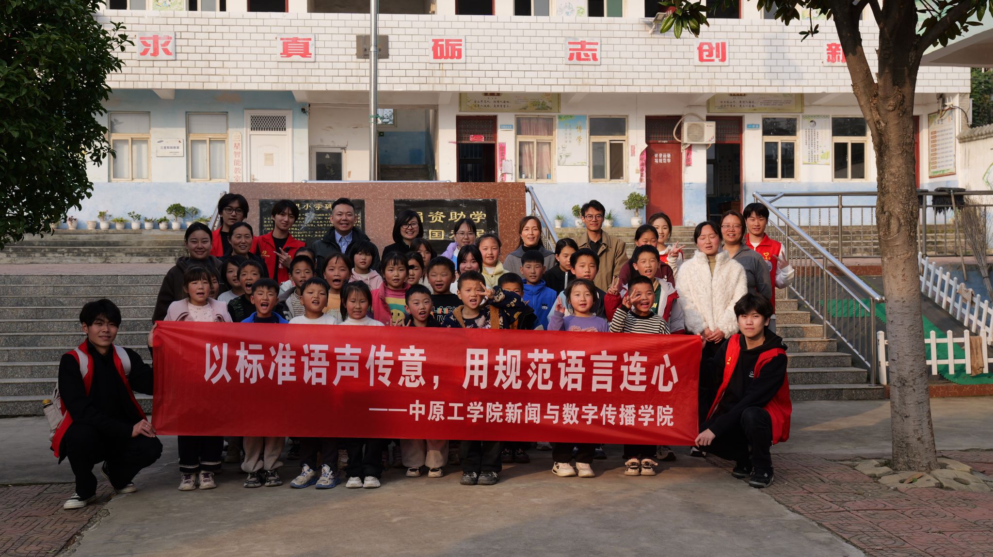 推普浸润童心,文化传承声伴成长。针对乡村学生普通话短板,新闻与数字传播学院党委副书记马肖华、播音与主持艺术系教师时燕子、王天瑞和学院“推普‘薪火相传’,助力乡村振兴”志愿服务团成员走进袁庄学校,以“童声诵雅言,普语润童心”为主题开展普通话推广活动。趣味课堂中,“击鼓传花”游戏与绕口令展示激发孩子们的参与热情,通过诵读《如果信仰有颜色》《彩色的中国》等诗歌节选,将语言训练与价值观培养相结合,为乡村教育注入新活力。